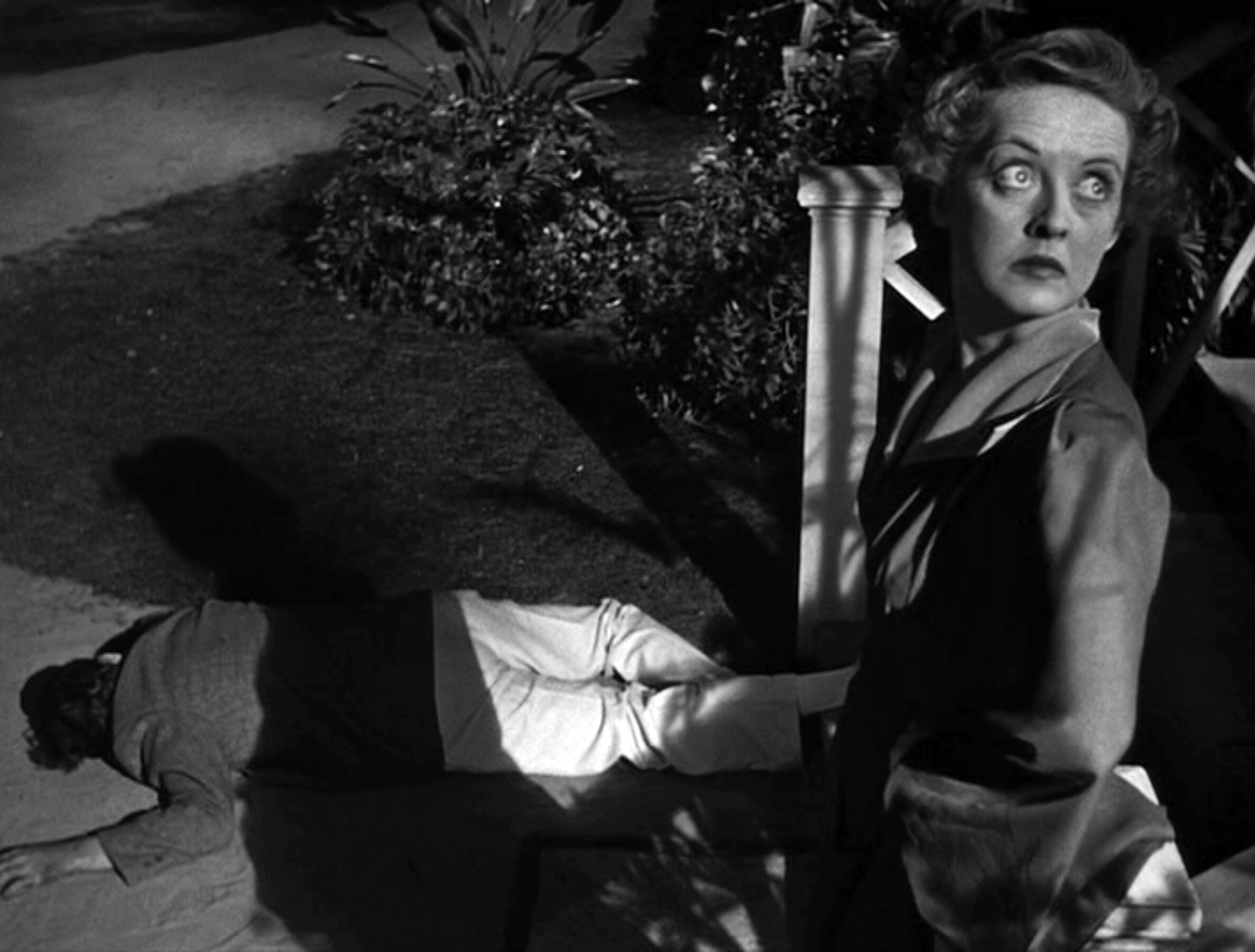 The workers run towards the house, stopping and staring at the dead man, and then at Davis with mingled apprehension and revulsion. She drops the gun, the first of many shots that will connect the ground to death, either past or future. Finally, the camera moves in for a close-up on Davis, establishing the suspense for the audience, the whydunit that can be every bit as compelling as a whodunit.