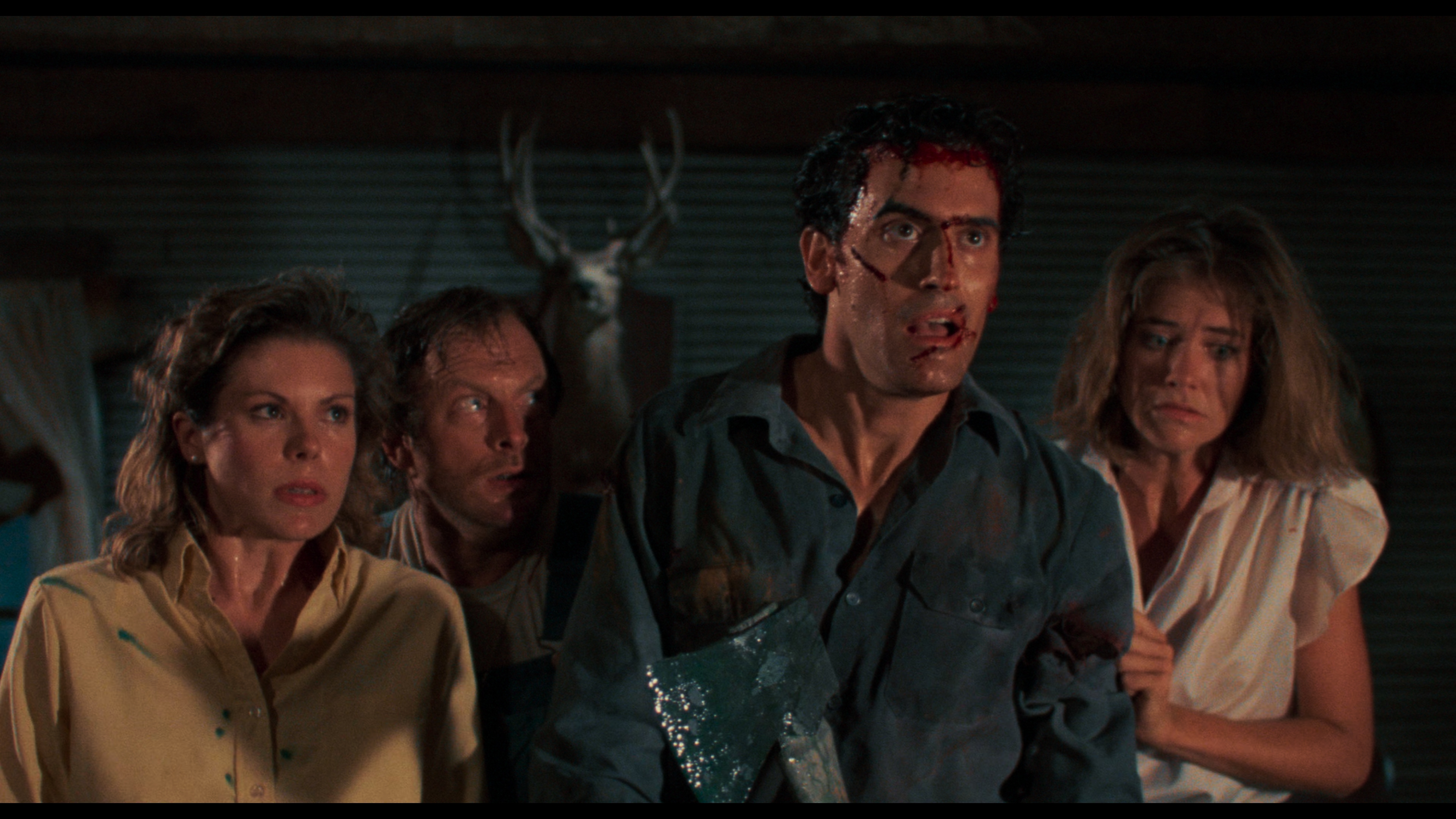 We are pummeled with swallowed eyeballs, snickering lamps, undead girlfriends, psychotic appendages, wisecracking doppelgangers, well-meaning archeologists, revenge-fueled hillbillies, a gigantic rotten apple-head demon, and geysers of red, green, yellow, and black blood. Bruce Campbell as the reluctant hero is being tortured to death like Wily Coyote or one of the Stooges but there’s also a lot of terror in the midst of the laughs. Mainly due to some frightening deadite imagery but even the sense of claustrophobia is felt.