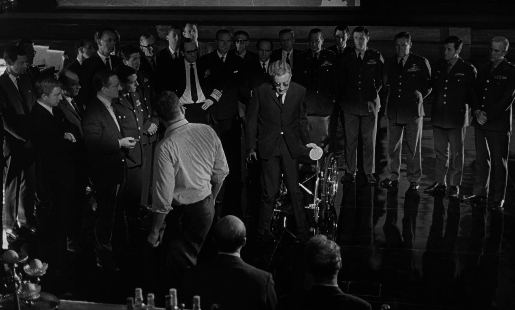 Speaking of absolute madness, can we talk about the brilliance of Peter Sellers in this? The character of Dr. Strangelove himself represents another target of the film's satirical attack: the military-industrial complex's embrace of former Nazi scientists and technocrats. As a wheelchair-bound ex-Nazi whose right arm occasionally gives an involuntary "Heil Hitler" salute, Strangelove embodies the moral compromises made in the name of military superiority. His enthusiastic plans for preserving a select portion of humanity in mine shafts, complete with a 10:1 ratio of fertile women to men, reveal how quickly thoughts of species survival can devolve into fantasies of authoritarian control. The fragility of the male ego sure is delicate. Instead of going to therapy, men would rather lead this country to self-destruction and societal annihilation. Oh and hide out in a bunker with their billions.