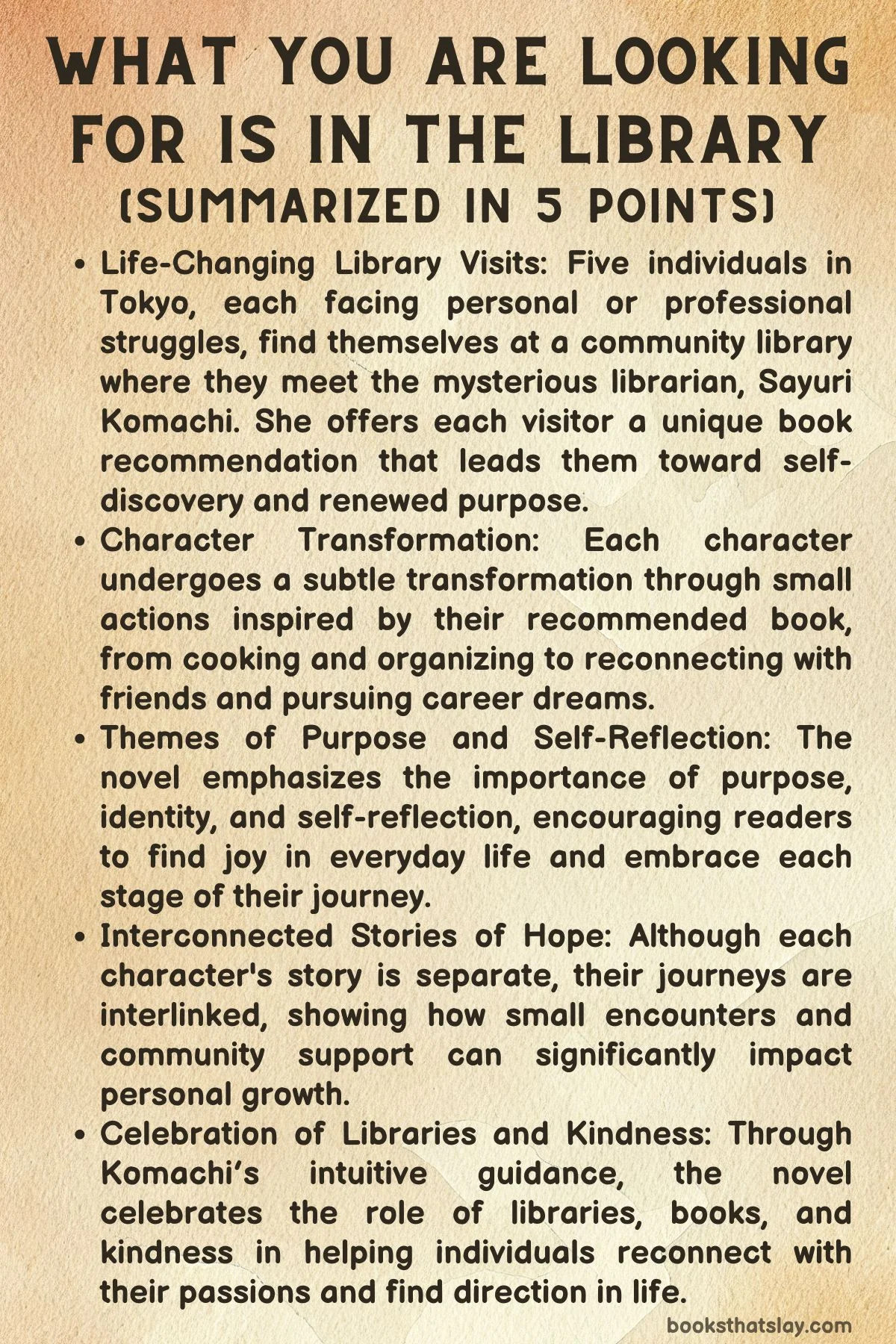 What You Are Looking for Is in the Library won't appeal to those seeking literary innovation or high stakes drama. Its pleasures are quieter, more contemplative—like a conversation with a wise friend rather than a theatrical performance. But for readers in need of hope and gentle guidance, this book offers a comforting reminder that transformation often begins with small steps and that what we're looking for might be closer than we think.